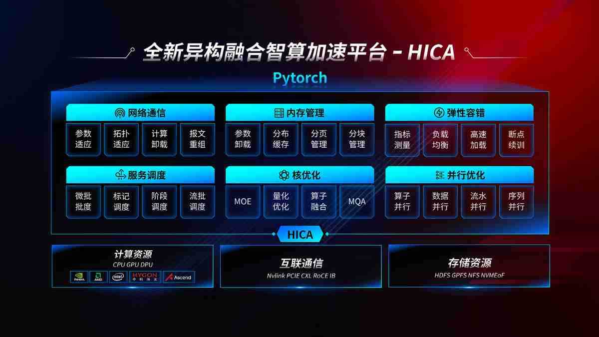 通过自研的服务层、、、、中间适配层、、、以及调度编排算法,,采用数据并行、、模型并行等多种并行方式,,,把并行计算任务进行有效的分解,,,使其分别由相应的软件栈和算力资源来承接。。。。当GPU资源变化,,,HICA可以实时动态调度计算子任务并调整模型拓扑和架构,,,以充分聚合各种算力资源。。。
